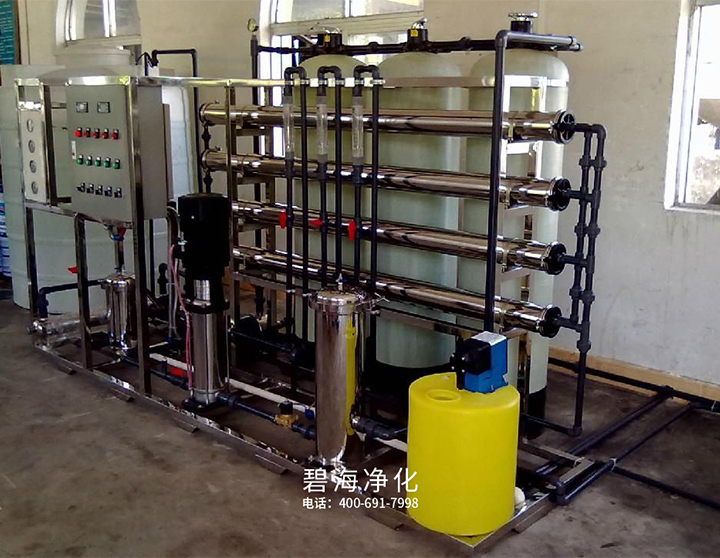 將純水與含有溶質(zhì)的溶液用一種只能通過水的半透膜隔開,此時(shí),純水側(cè)的水就自發(fā)的透過半透膜,進(jìn)入溶液一側(cè),溶液側(cè)的水面升高,這種現(xiàn)象就是滲透。當(dāng)液面升高至一定高度時(shí),膜兩側(cè)壓力達(dá)到平衡,溶液側(cè)的液面不再升高,這時(shí),膜兩側(cè)有一個(gè)壓力差,稱為滲透壓 。如果給溶液側(cè)加上一個(gè)大于滲透壓的壓力,溶液中的水分子就會(huì)被擠壓到純水一側(cè),這個(gè)過程正好與滲透相反,我們稱之為反滲透。我們可以從反滲透的過程看到,由于壓力的作用,溶液中的水分子進(jìn)入純水中,純水量增加,而溶液本身被濃縮。本設(shè)備使用的反滲透膜是半透性螺旋卷式膜,當(dāng)原水以一定的壓力被送至反滲透膜時(shí),水透過膜上的微小孔徑,經(jīng)收集后得到純水,而水中的雜質(zhì)如可溶性固體、有機(jī)物、膠體物質(zhì)及細(xì)菌等則被反滲透膜截留,在截流液中濃縮并被去除。一級(jí)反滲透可去除原水中97%以上的溶解性固體。
