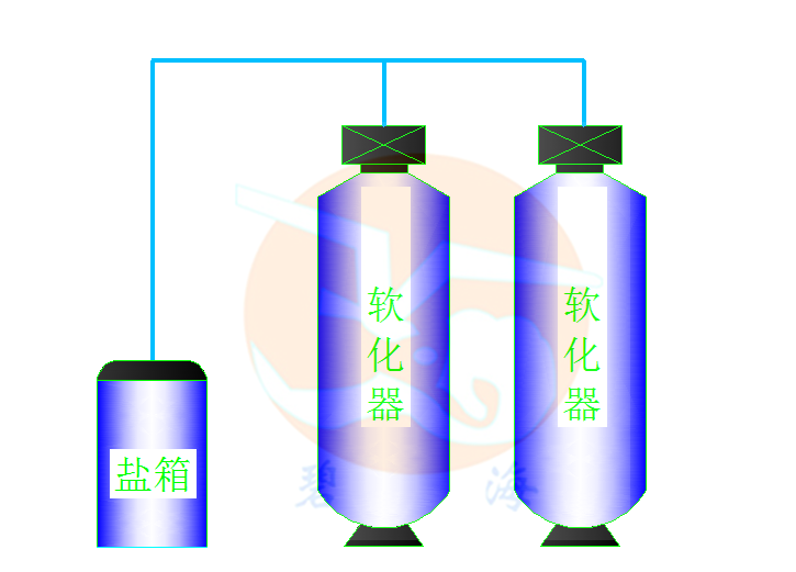 原水在一定的壓力(0.2-0.6Mpa)、流量下,通過控制器閥腔,進入裝有離子交換樹脂的容器(樹脂罐),樹脂中所含的Na+與水中的陽離子(Ca2+,Mg2+,Fe2+……等)進行交換,使容器出水的Ca2+,Mg2+離子含量達到既定的要求,實現了硬水的軟化。