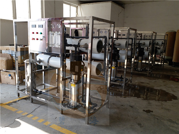 反滲透裝置是將原水經過石英砂過濾器、活性碳過濾器、精細過濾器、軟化器,精密過濾器等四級過濾后,再通過高壓泵加壓,利用反滲透膜的將水中的工業污染物、鈣鎂離子、重金屬、細菌、病毒等大量混入水中的雜質全部隔離,使較高濃度的水變為低濃度水,同時從而達到飲用規定的理化指標及衛生標準,產出至清至純的水,潔凈度幾乎達98%,所以稱這種產水設備為反滲透純水設備。
