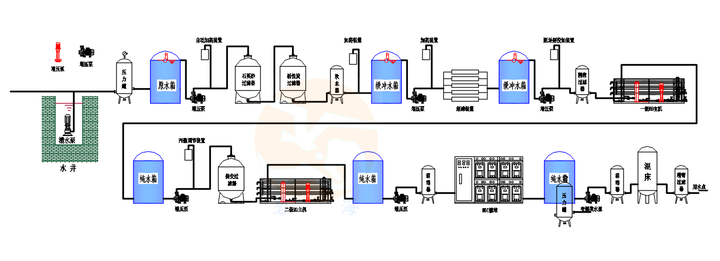 原水(自來水或井水)→原水箱→原水增壓泵→石英砂過濾器→活性炭過濾器→軟水器→精密過濾器→高壓泵→RO反滲透機組→儲水箱→變頻控制器→增壓泵→消毒系統(tǒng)→供水管網(wǎng)→用水點