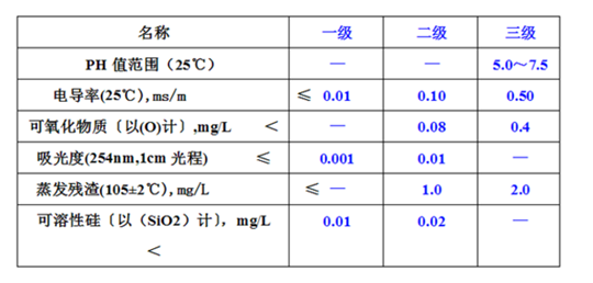 (3)由于在一級水的純度下,難于測定可氧化物質和蒸發的殘渣,對其限量不做規定。可用其他條件和制備方法來保證一級水的質量。